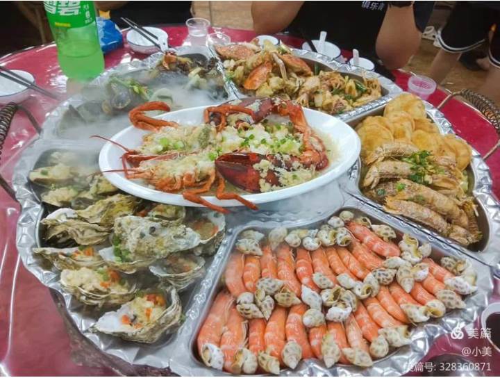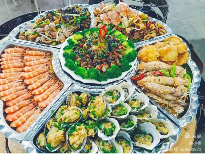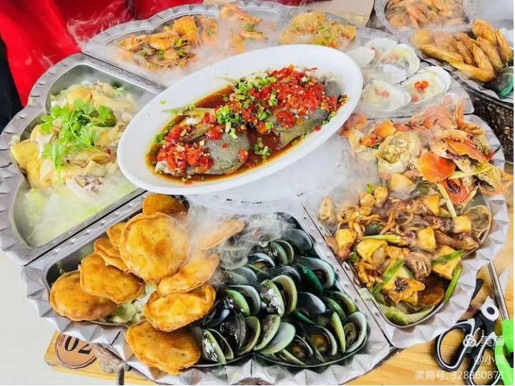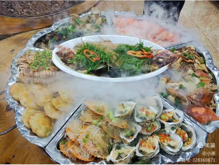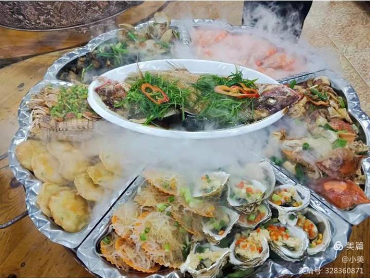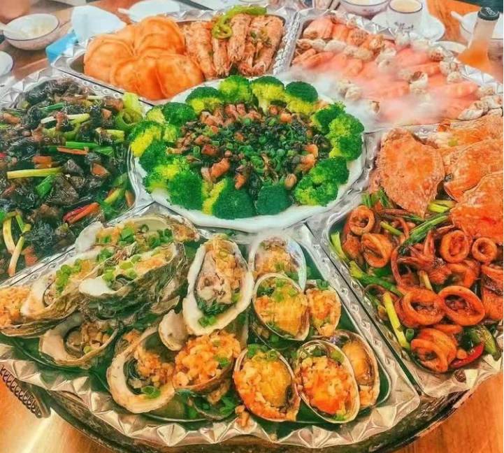 海鲜汤 清蒸金仓 蒜蓉蒸生蚝 虾饼或海蟹(时令调换) 海虾 豉汁蒸排骨 酸辣土豆丝 港口炒鱼饼 海蛤蒸水蛋 五花肉焖油豆腐 农家时菜 米饭 水果
