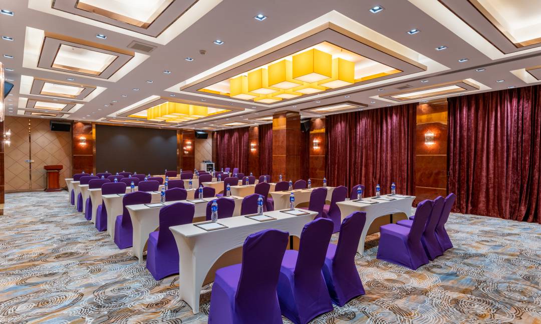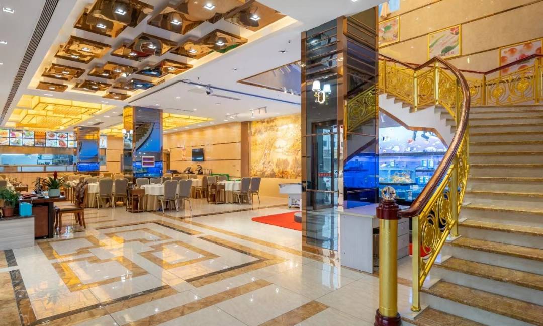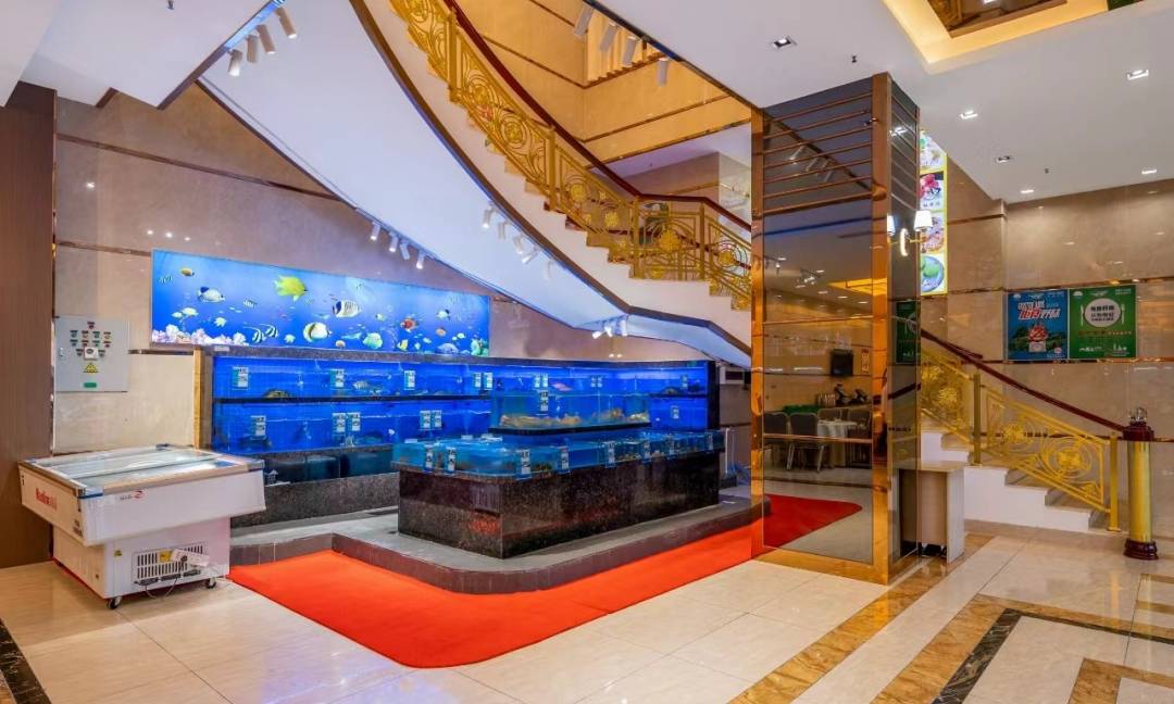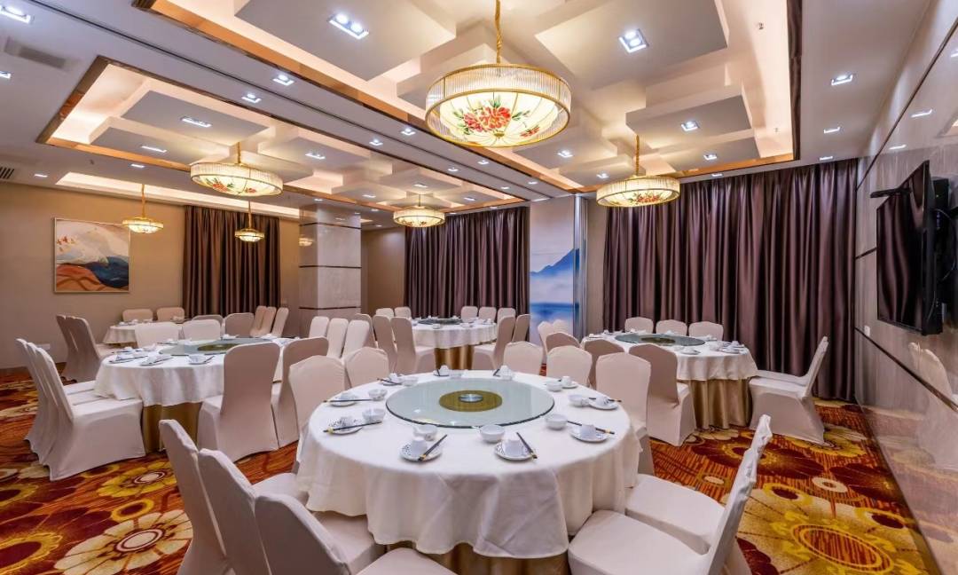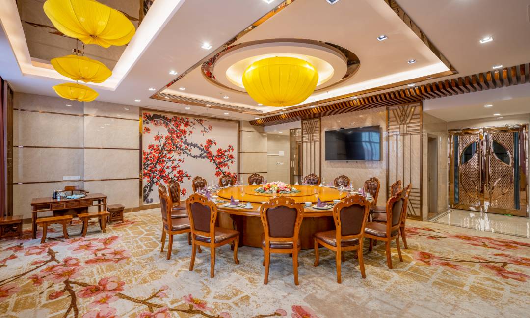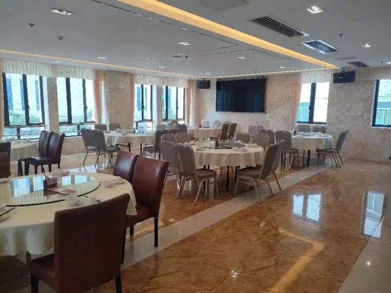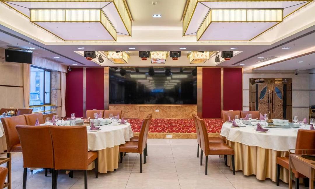 一楼大厅摆12席,二楼大厅能摆20席,大厅有柱子,有LED,三楼包间15间,大包间最多能坐28人,连通包间最多能摆5席