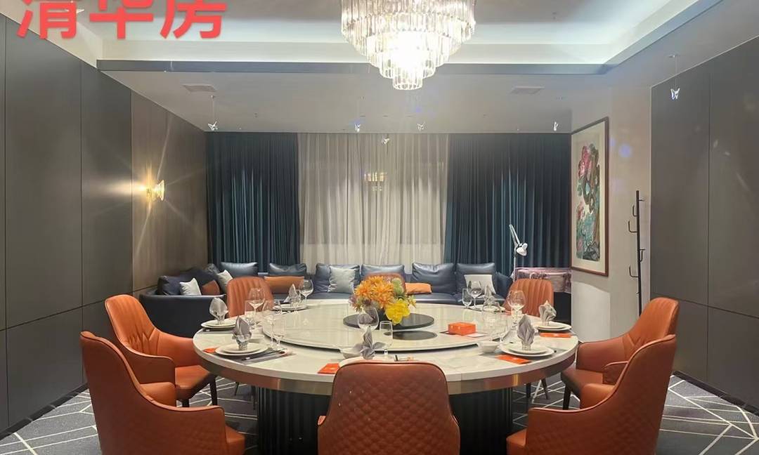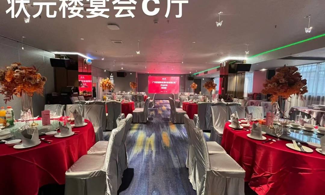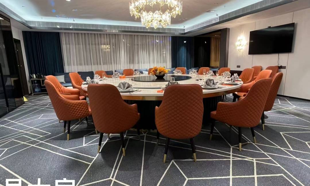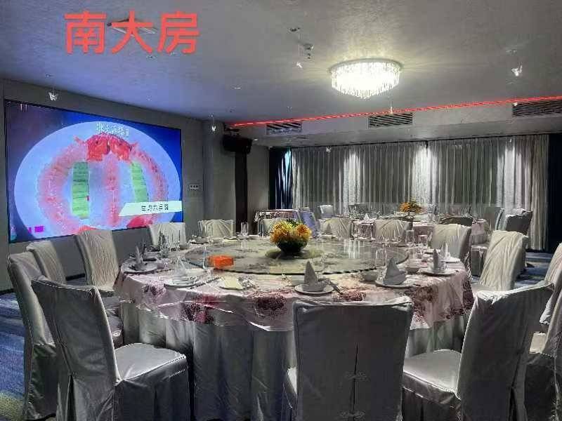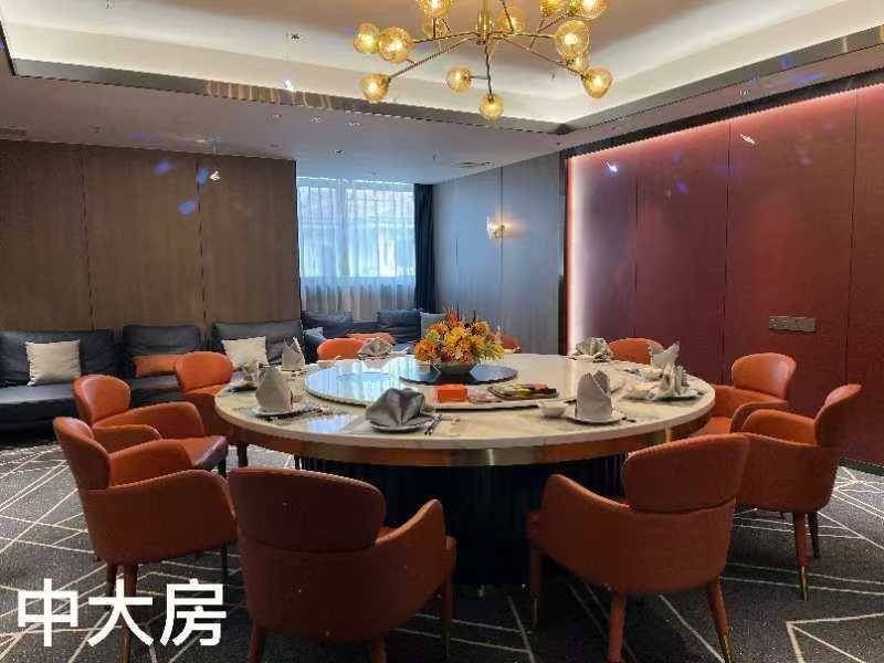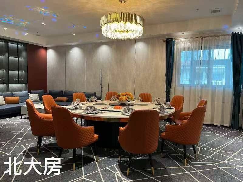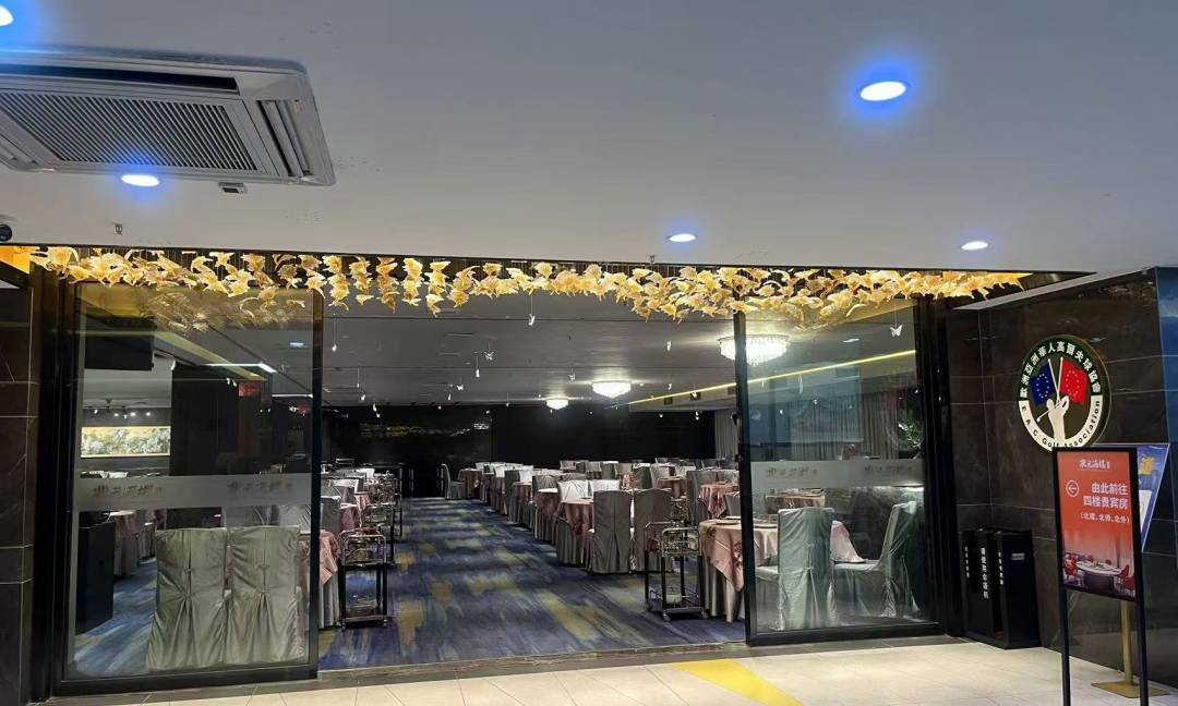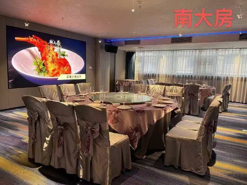 A厅摆15席,B厅摆10席,C厅摆8席。三楼全厅能摆30席,大厅有柱子,有LED,有咪,三楼包间6间,四楼包间3间,大包间最多能坐28人。