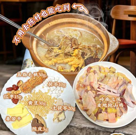 莫氏同款祛湿汤底(五指毛桃30g+茯苓10g+红枣15g+黄豆30g+土茯苓20g+姜若干+陈皮3g) 三黄鸡1只(斩块) 糯米鸡米饭(含炒油麦菜一份) 支竹1份 冬瓜1份 豆干1份 青菜2份 猪肉饼1份