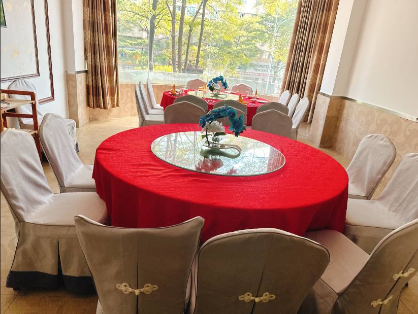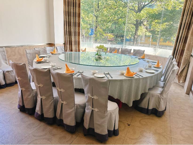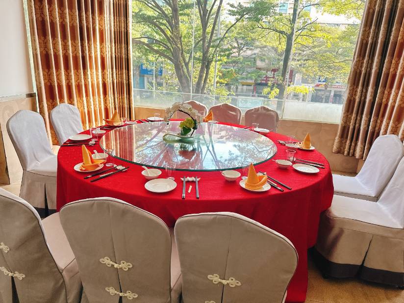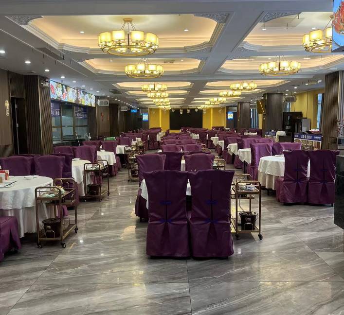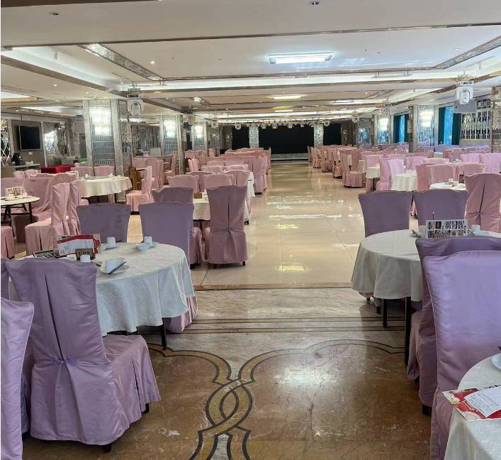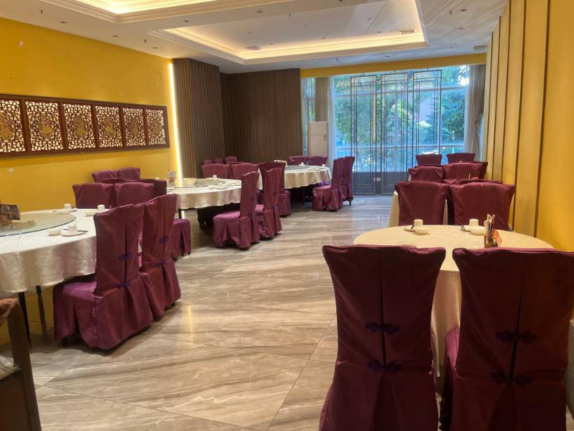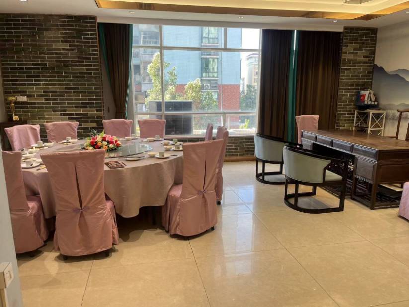 大厅一次性可以容纳80席团餐(二楼30席,三楼50席) 二楼房间共有6间(有5间是独立房间,有一间房可以摆6席)