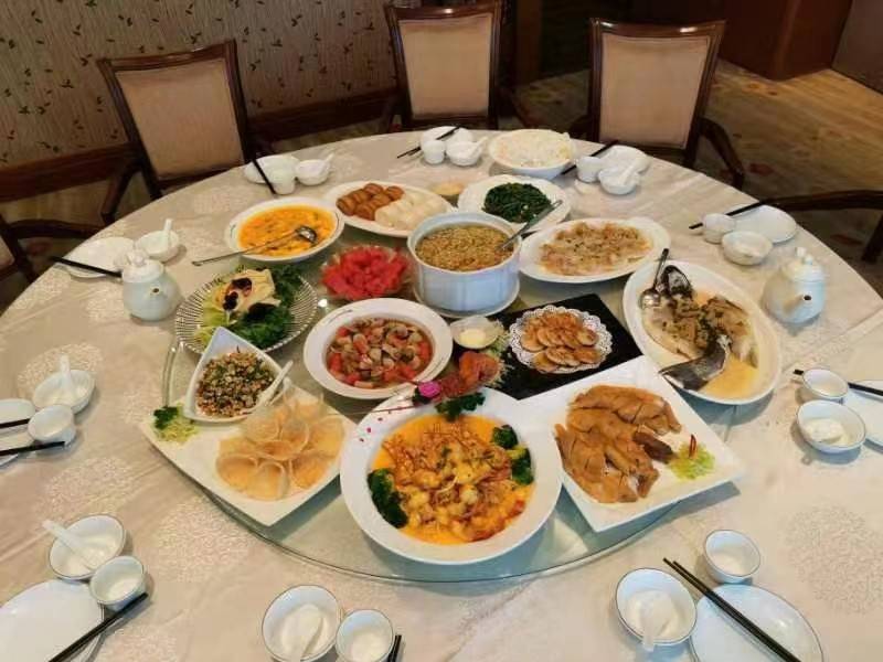 瓦煲老火靓汤 鱼翅捞饭/位上 巧手无骨鱼(两条) 招牌葱油鸡一只 菠萝生炒骨 香酥鱼捞云耳 过侨豆腐 豆角炒茄子 招牌小炒皇 白贝浸海带 手工水饺 丝苗米饭 时令水果