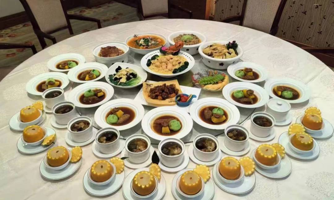 鲍汁鱼翅花胶羹 招牌黑汁叉烧 金不换脆皮烧鸡 椒麻汁淋巴沙鱼片 红颜水花胶煮鱼腐 黄金万斗海鲜盏 黑松露蒸初生蛋 笋尖炒花肉 鲍汁绿豆酿莲藕 上汤时蔬 酒心红糖糕 红枣汁炖燕窝 水果+香米饭