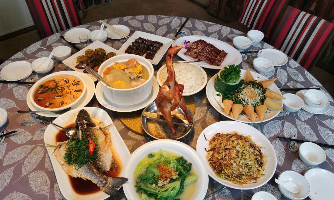 无花果炖瘦肉汤 栋笃鸡一只 江河一品鲜 农家酿三宝 荷塘小炒 支竹捞生鱼片 原味鲜笋 虎皮尖椒爆鹅肠 浓汤浸时蔬 丝苗米饭 岭南佳果