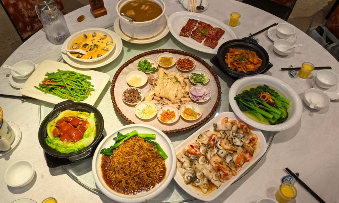 明火靓汤 烧鸡一只 清蒸鲩鱼 一桶小炒皇 浓汤浸时蔬 鲜贝蒸农家蛋 烧排骨 好味生炒斋 煎让三宝 精美点心 丝苗米饭 岭南佳果