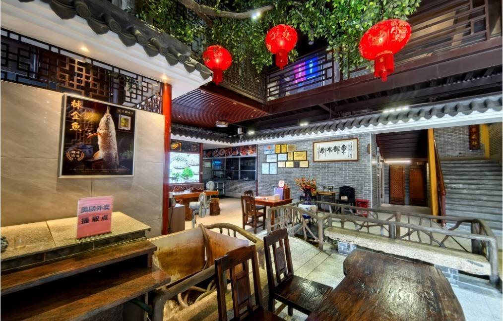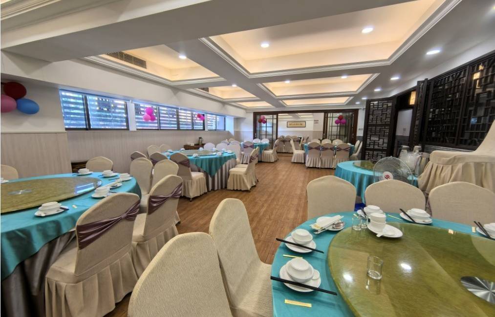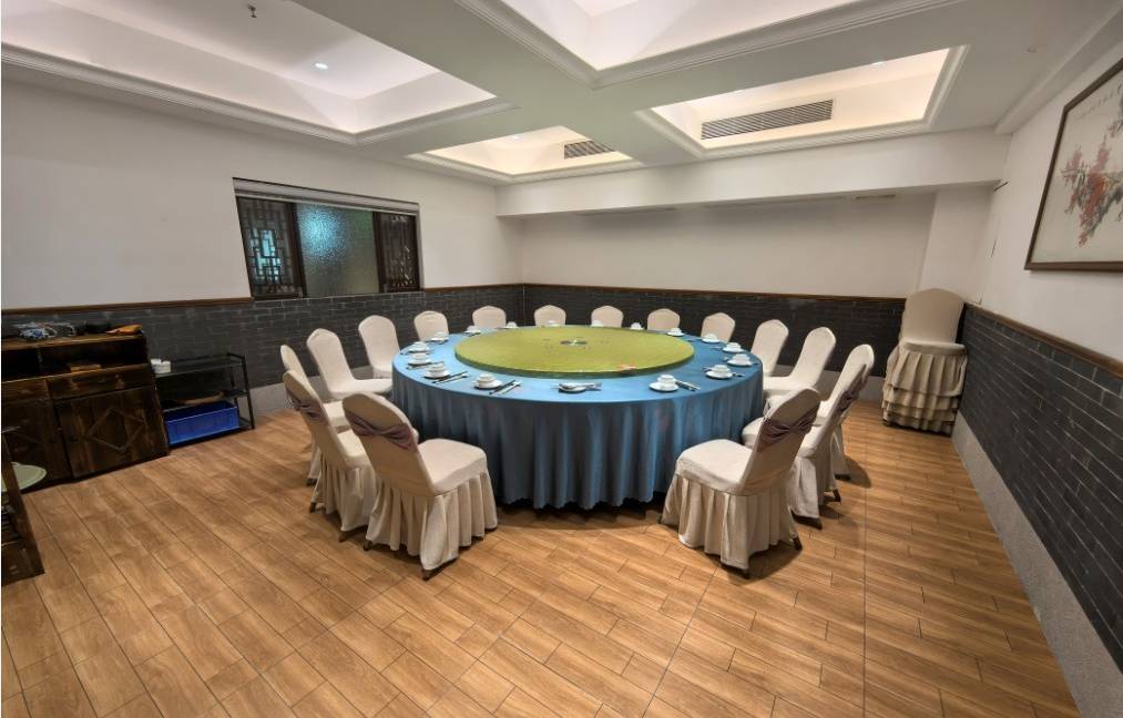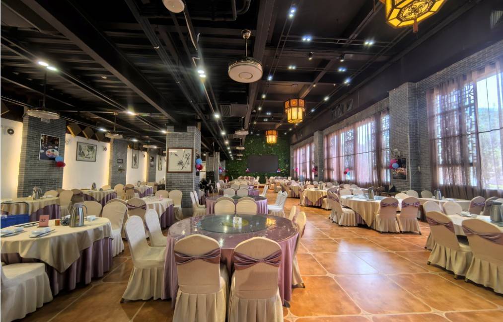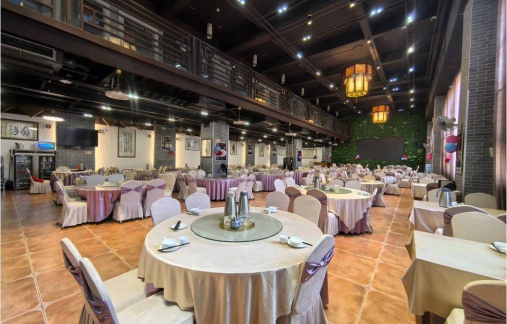 一楼大厅摆26席,二楼房间摆6-8席,大厅有柱子,电视屏膜,有话筒,二楼大包间两桌最多能坐24人
