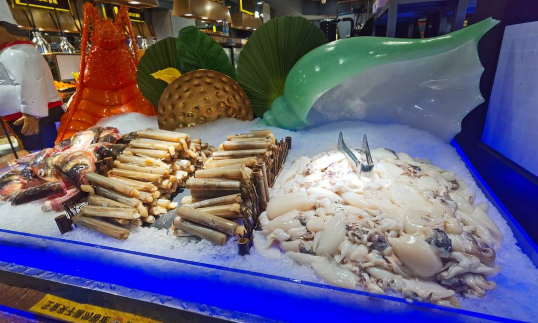 海鲜;大闸蟹,三点蟹,花蟹,基围虾,水鱼,圣子,黄骨鱼,海参,黄金贝,墨鱼仔,鱼头,沙甲,白贝,八爪鱼,罗氏虾,九节虾,皮皮虾,美国贝,圣子王,海螺,八爪鱼,鱿鱼,鲍鱼,章鱼须,夏夷贝,蓝口贝,生蚝等(海鲜有季节性)