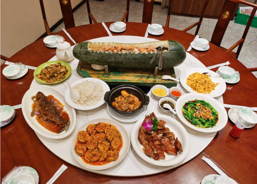 海皇冬瓜船 吊烧泉水鸭仔一只 泰汁茄子 豆付煲醋溜土豆丝 沙姜猪手 清蒸鲩鱼1条 盐水菜心 丝苗米饭