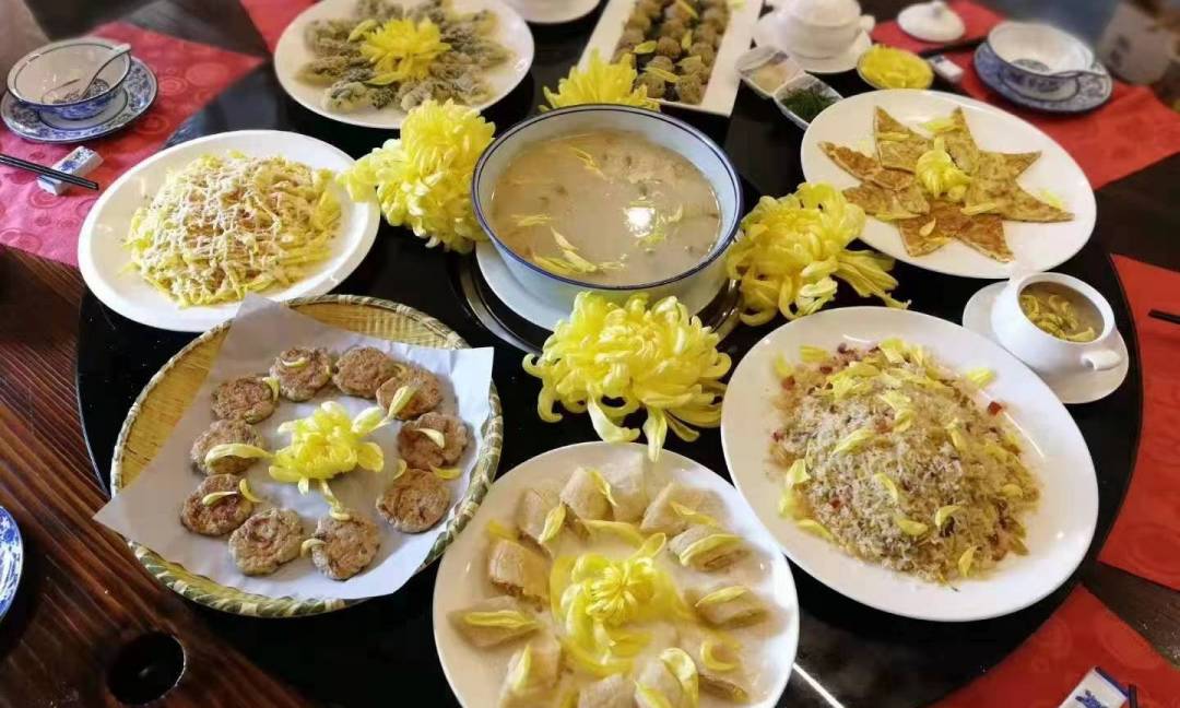 小食:菊花脆香花生 菊茶:菊花菊胎靓茶 菊花沙律酱刺身 菊花梗炖龙骨汤 菊花腊味蒸黄花 菊花稻香蒸鸡 菊花甘香鲮鱼球 菊花特色酿豆腐 菊花長脚菜花肉 菊花榄香肉 菊花黄金炒饭 菊花玲珑时蔬 精美靓点心 岭南靓佳果
