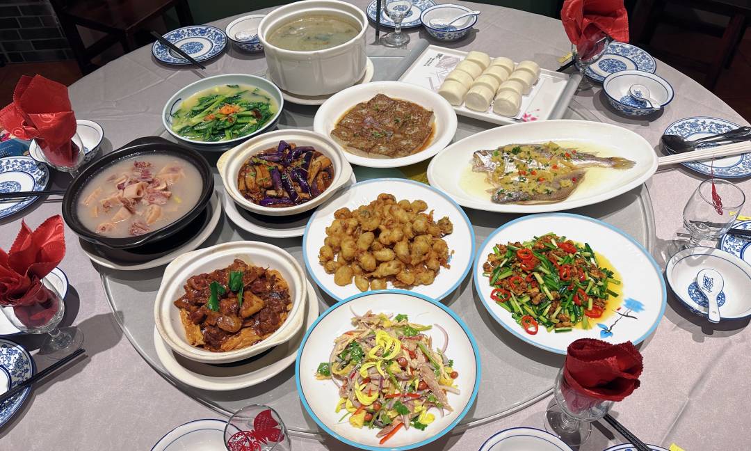 時日靚湯 招牌菊花撈雞 海鲈鱼 尖椒爆炒風情骨 香山碧綠小炒 清蒸水蛋 土豬肉碎燜茄子 風味南瓜 上湯時蔬 精美点心 絲苗米飯